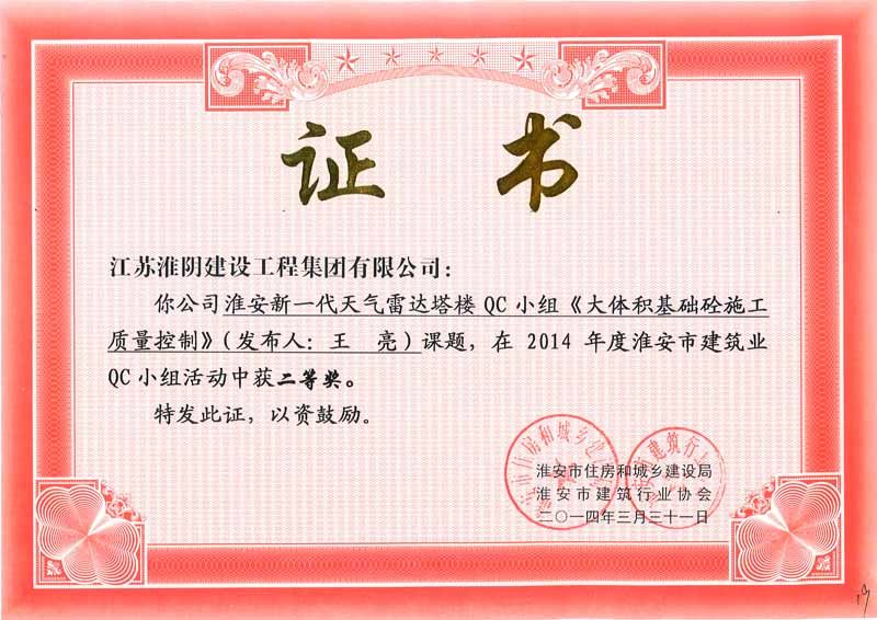 2014年度QC二等奖淮安新一代天气雷达塔楼《大体积基础砼施工质量控制》王亮