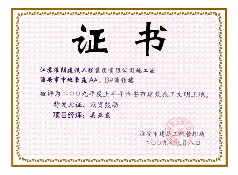 2009年市文明工地淮安市中地华庭A#、B#商住楼-吴亚东